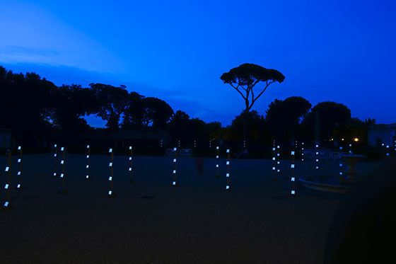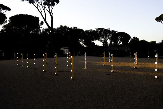 The installation covers a 35 x 50 m area. It is made of 55 timber pillars distributed on a radial grid. Despite the topographic variations of the Piazzale, each one is standing straight in relation to Earth, and despite its large span, each one is turned the same way towards the sun. The 55 pillars are holding 220 mirrors, individually adjusted to project the reflection of the setting sun to the single space of the Loggia.
