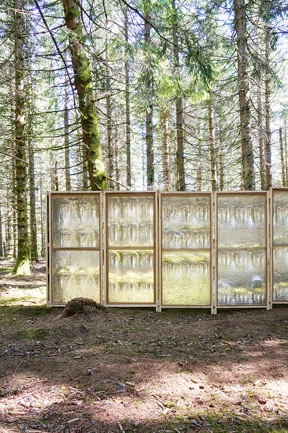 L’installation est composée de 60 dispositifs optiques qui projettent 60 points de vue légèrement différents sur un même écran, offrant à son regardeur le don temporaire d’ubiquité sur une petite parcelle de forêt. L’écran est composé de 8 tableaux en résine sur toile de lin tendue sur châssis (le matériaux et la techniques du peintre). Ce sont des pièces uniques, résultat d’un processus d’atelier qui mélange des empreintes de sol, de murs, de tronc, dans des compositions qui s’inspirent de cartes, de contes et de paysages.
