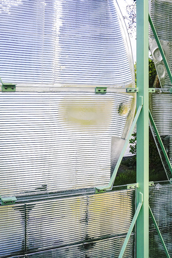 La campagne invente, teste rectifie, teste et améliore ; elle expérimente à l’échelle 1. Elle invente des filets, substances d'une architecture pensée au photon près, spéculaire et coloré. Positivement photoséléctive, à 5% d’ombre.